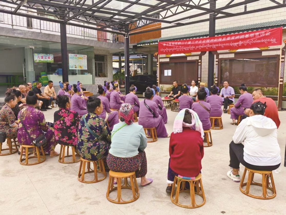 近年来,勐海县勐海镇党委以文明实践所(站)为抓手,统筹志愿服务力量,通过双语宣讲、田间课堂等形式开展“五个普及”活动。目前已组织活动350余次,惠及2.8万余人,将党的关怀与文明新风送到群众身边。图为志愿者在曼袄村民小组宣讲党的二十届三中全会精神。 (陈金 乐志)
