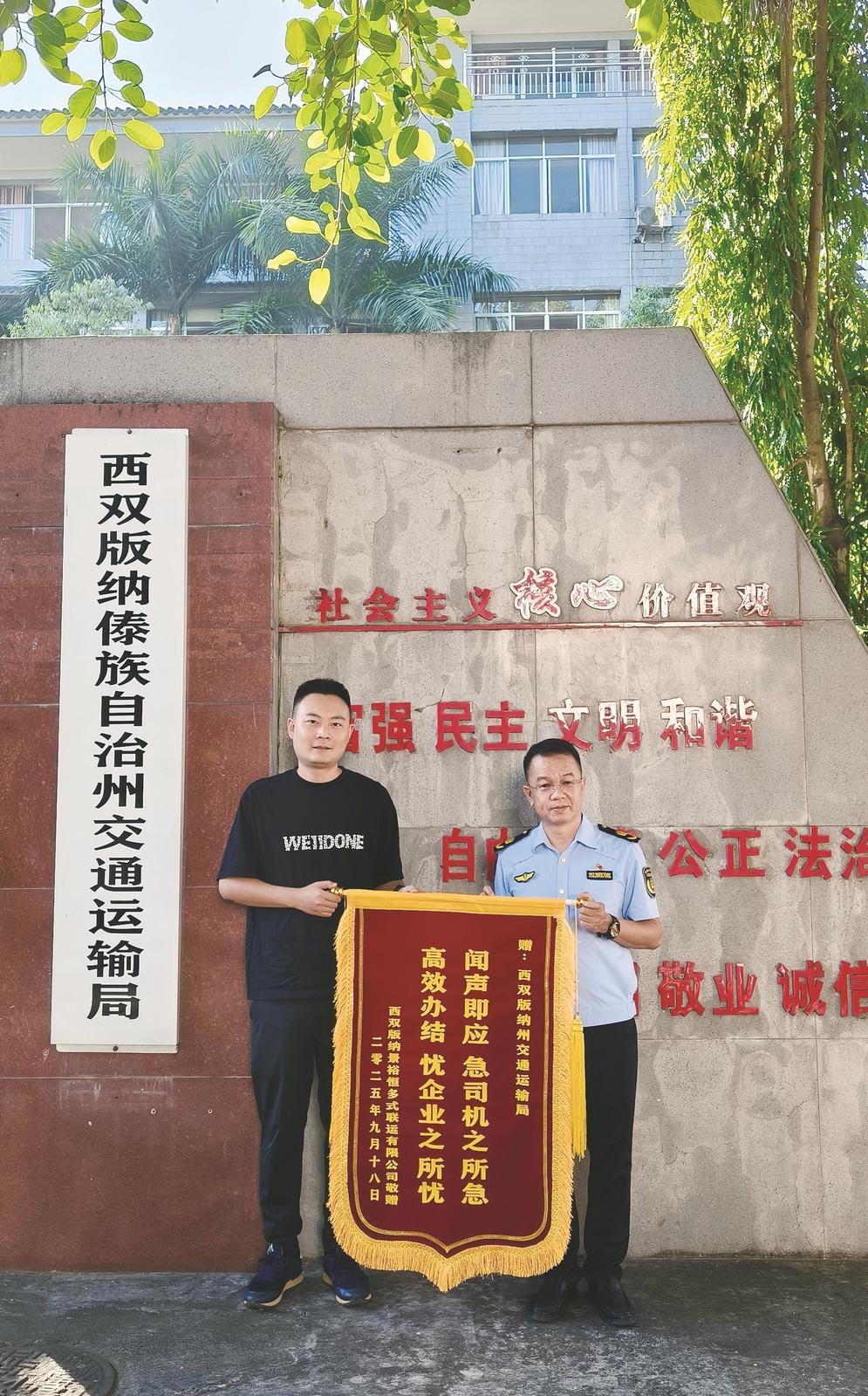 10月31日,西双版纳景裕恒多式联运公司负责人来到州交通运输局,送上写有“闻声即应 急司机之所急、高效办结 忧司机之所忧”字样的锦旗。该负责人表示,因为交通部门工作人员主动上门服务,用最短的时间解决了他们企业的燃眉之急。这种未诉先办的服务帮助企业渡过了难关,让他们真切感受到了优质的营商环境,坚定了投资发展的信心。