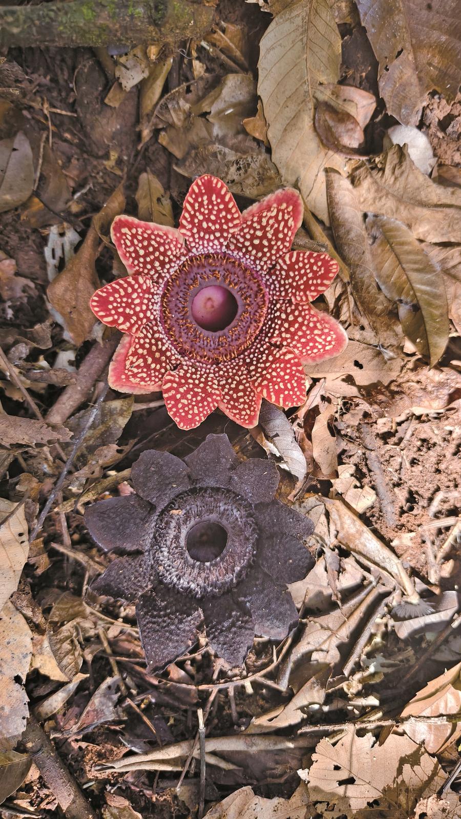 据护林人员介绍,在保护区山坡至半山坡的原始雨林中,猩红色的寄生花零星分布于林下腐殖层,直接从宿主扁担藤的根部萌出。这已是该区域连续第3年观测到这一国家二级保护植物绽放。