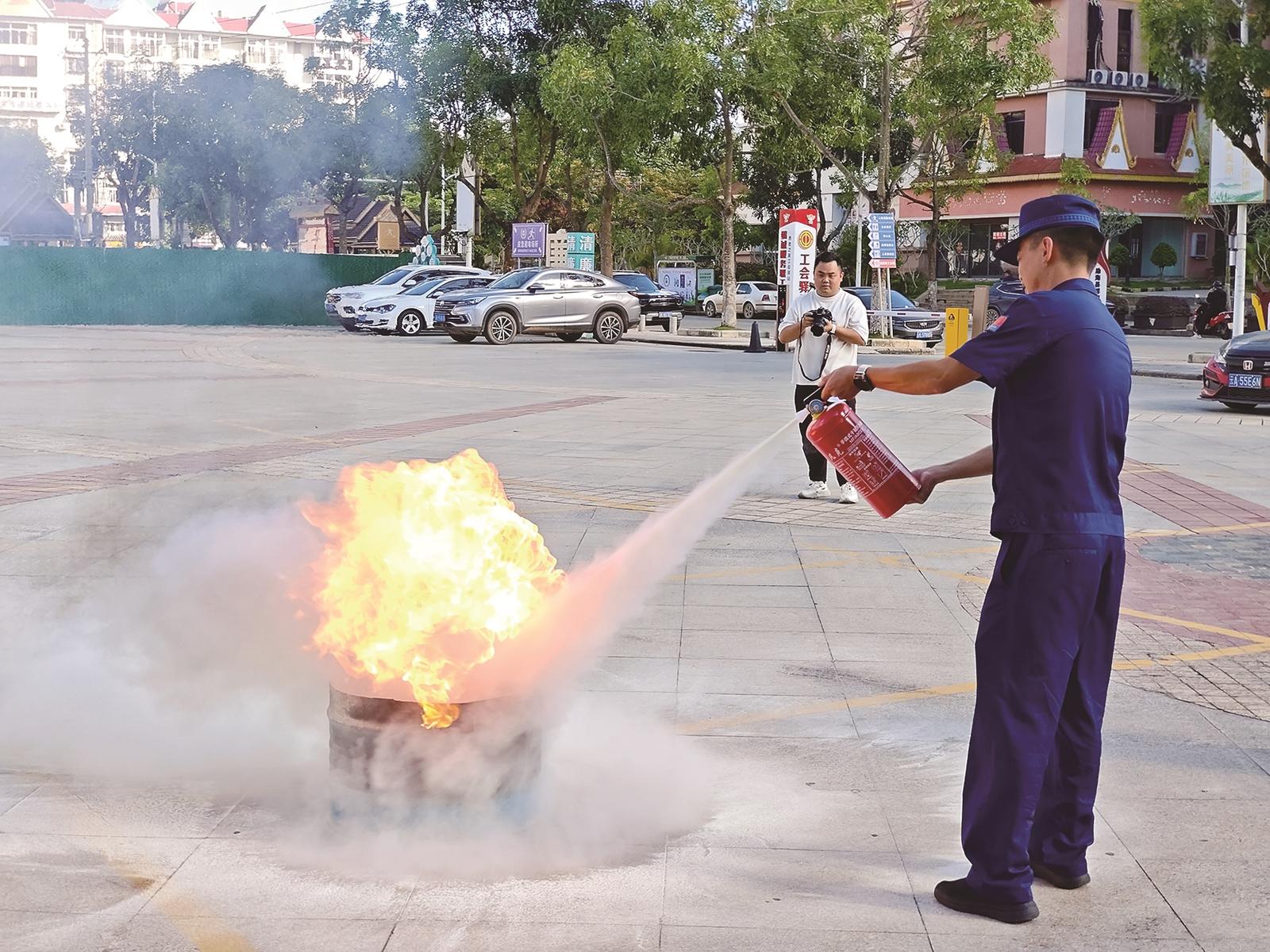 消防员演示灭火器操作方法。通讯员 晏霖 摄