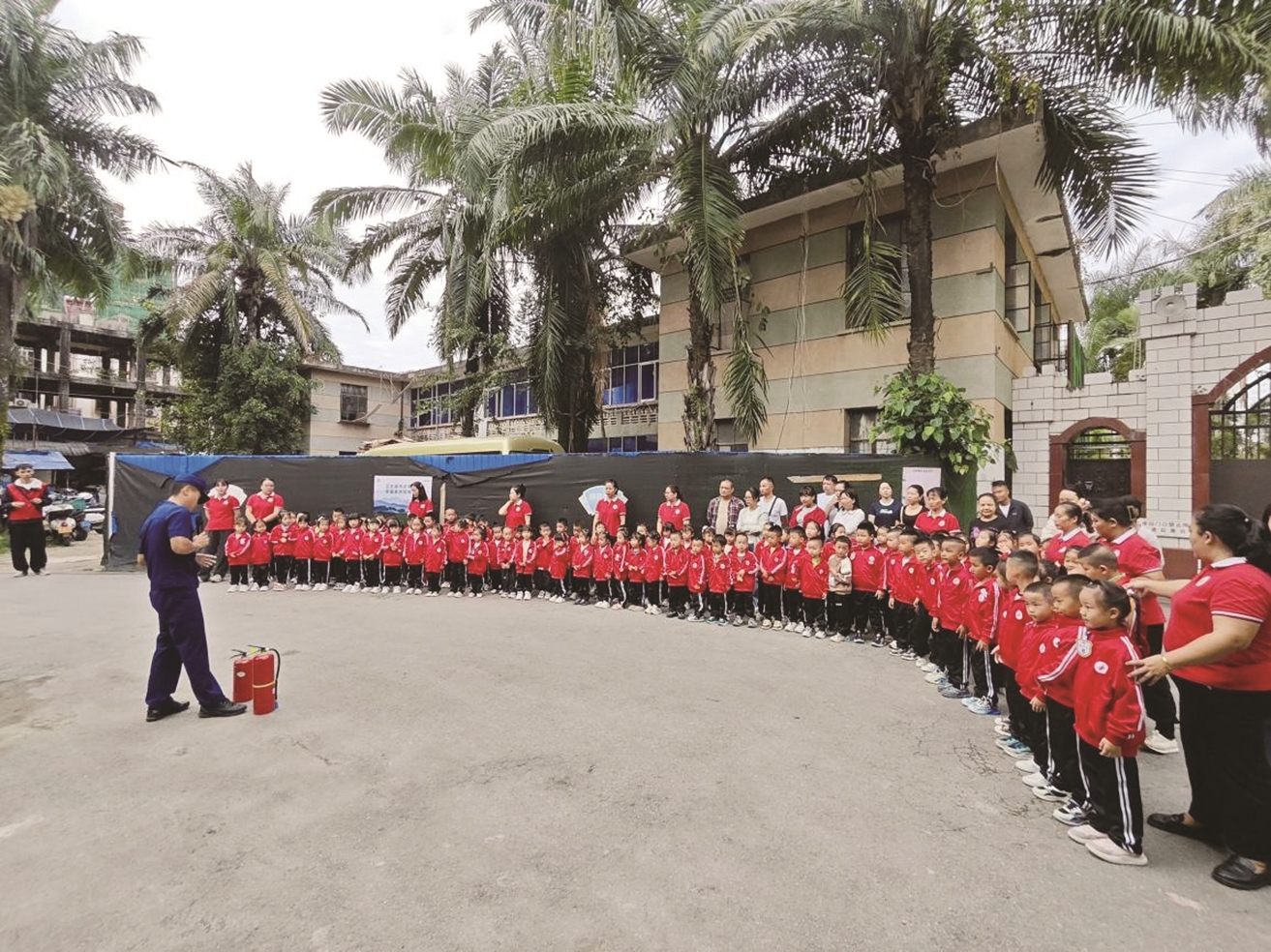 理论讲解结束后,开展了实操演练,组织幼儿园教职工、社区居民代表依次使用干粉灭火器灭火。消防队员还带领小朋友们参观消防车,逐一介绍高压水枪、破拆工具等随车器材的功能用途,通过触摸体验、趣味问答等形式,让小朋友们不断加深对消防安全的认知。(黄晓艳)