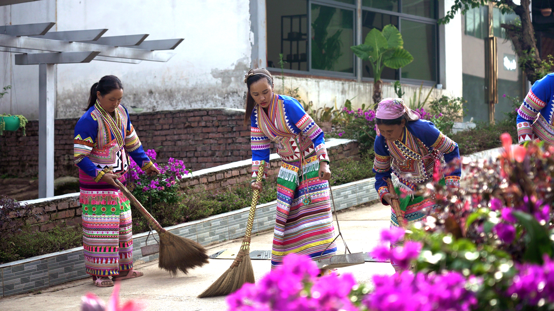 走进这座拉祜族村寨,家家户户精致的庭院令人眼前一亮。石板小径蜿蜒穿过花丛,三角梅在墙角热烈绽放,竹制桌椅摆在树荫下,柴火码得像“豆腐块”般整齐。“以前哪敢想院子能这么美!”村里的老人语气里满是感慨,“那时候院墙堵得慌,柴火堆得比人高,想找个坐的地方都难,现在坐在院子里喝茶,比城里公园还舒服。”