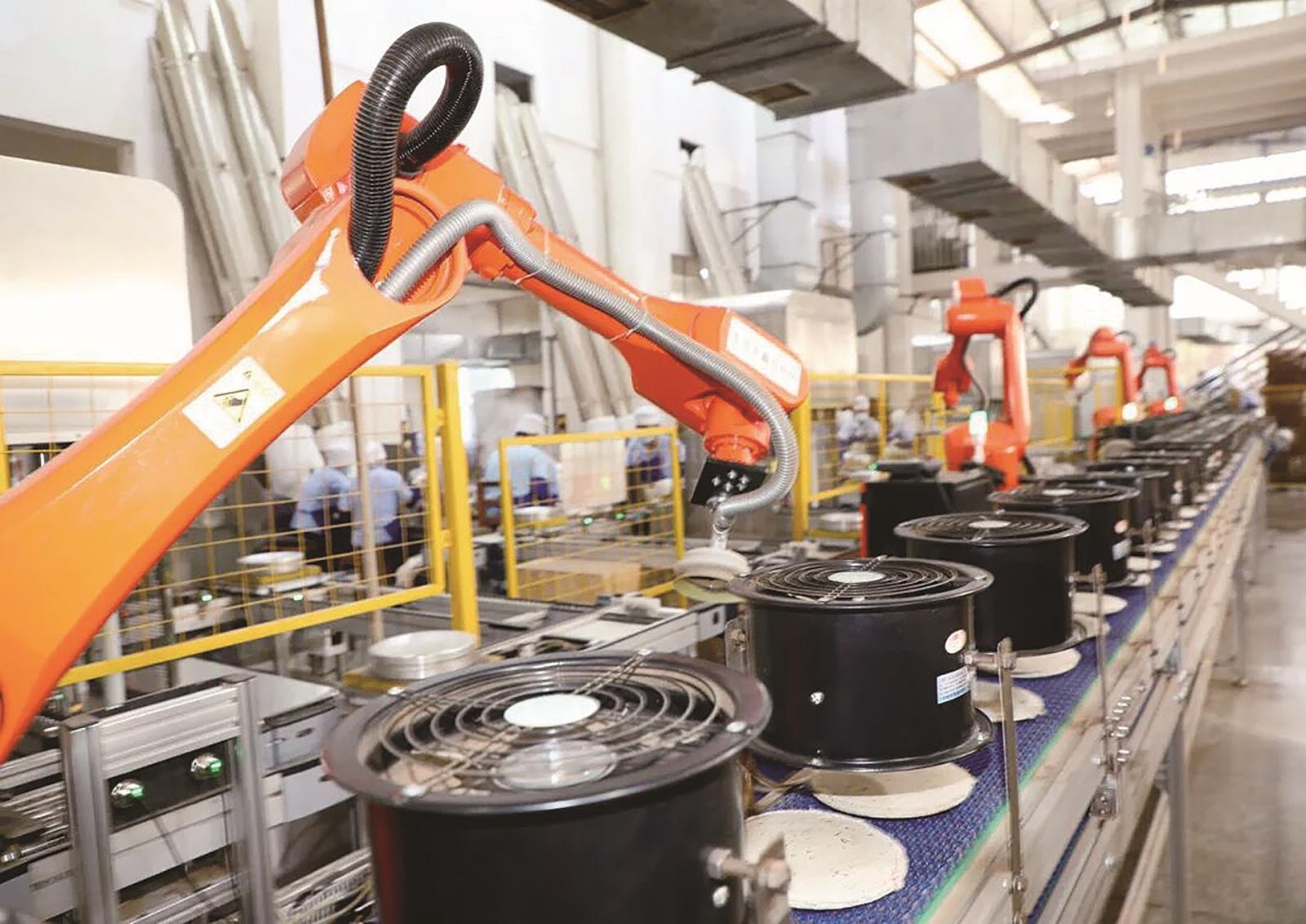 工业机械臂正在进行揉茶、压饼工序。
