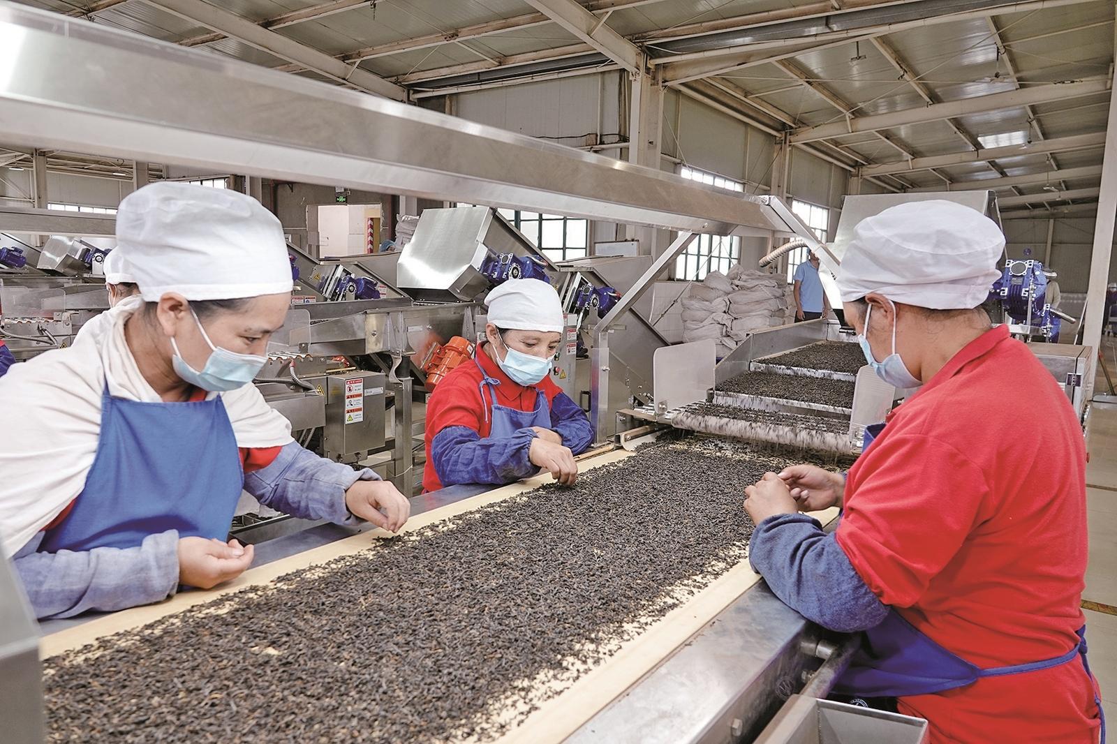 人工加机器拣剔茶叶杂质。记者 马芸 摄