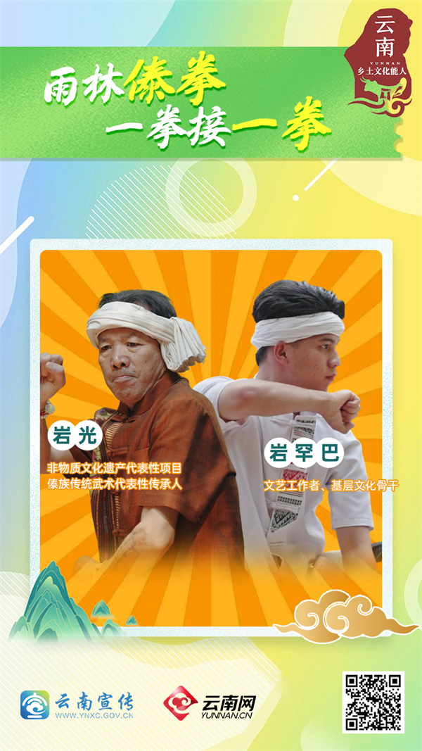 傣拳起处,雨林回响。一招一式之间,藏着飞禽走兽的灵动姿态,刚柔并济的力道中蕴着傣家人敬畏自然、坚韧豁达的精气神。在西双版纳傣族自治州景洪市,有两位乡土文化能人——一位是深耕技艺数十载的非遗代表性传承人岩光,一位是崭露头角的青年后辈岩罕巴。他们以傣拳为媒,以“传帮带”为桥,让承载着傣族精气神的武术技艺,在坚守与接力中焕发新生,书写着傣族武术守正创新的动人篇章。