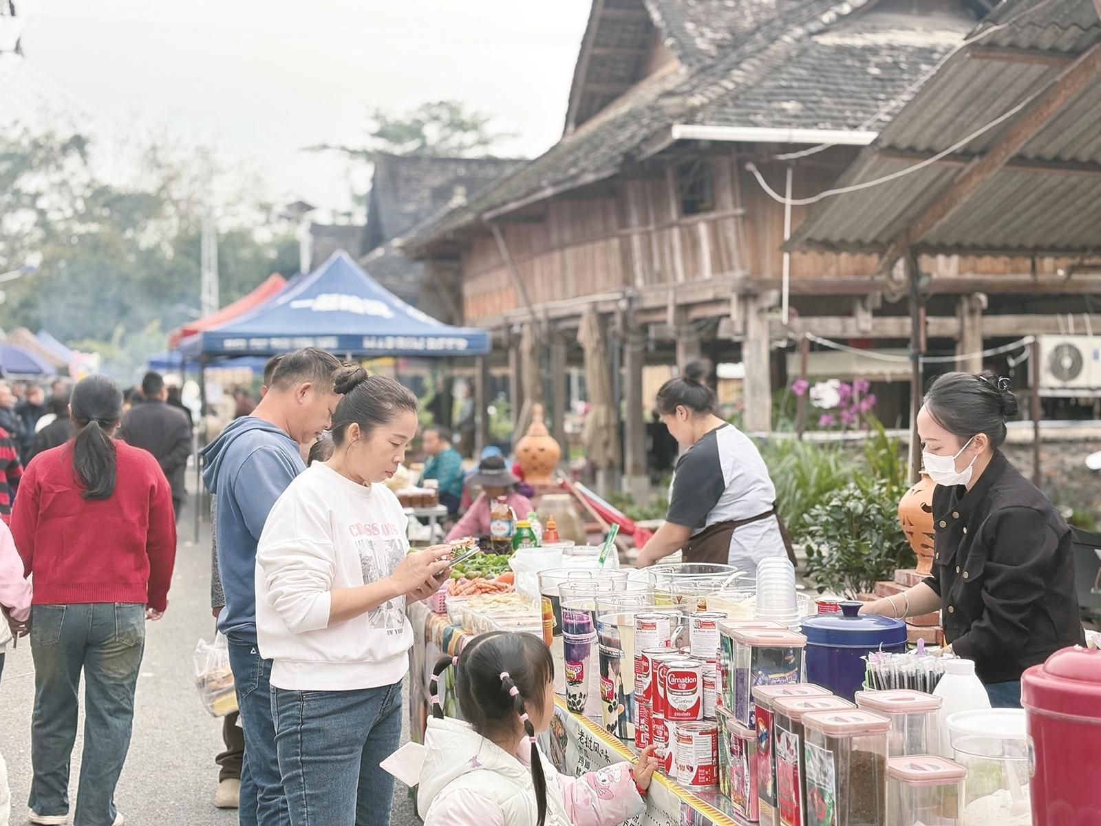 傍晚时分,夜市迎来另一番热闹景象。精彩的文艺表演在村寨“寨心”位置上演,既为游客提供歇脚欣赏的空间,也让民族传统文化在生活场景中得到展示与传承。夜市共提供80个免费摊位,吸引了本地村民、手工艺人、返乡青年等积极参与。摊主们表示,这种零门槛创业,为他们提供了在家门口就业增收的好机会。