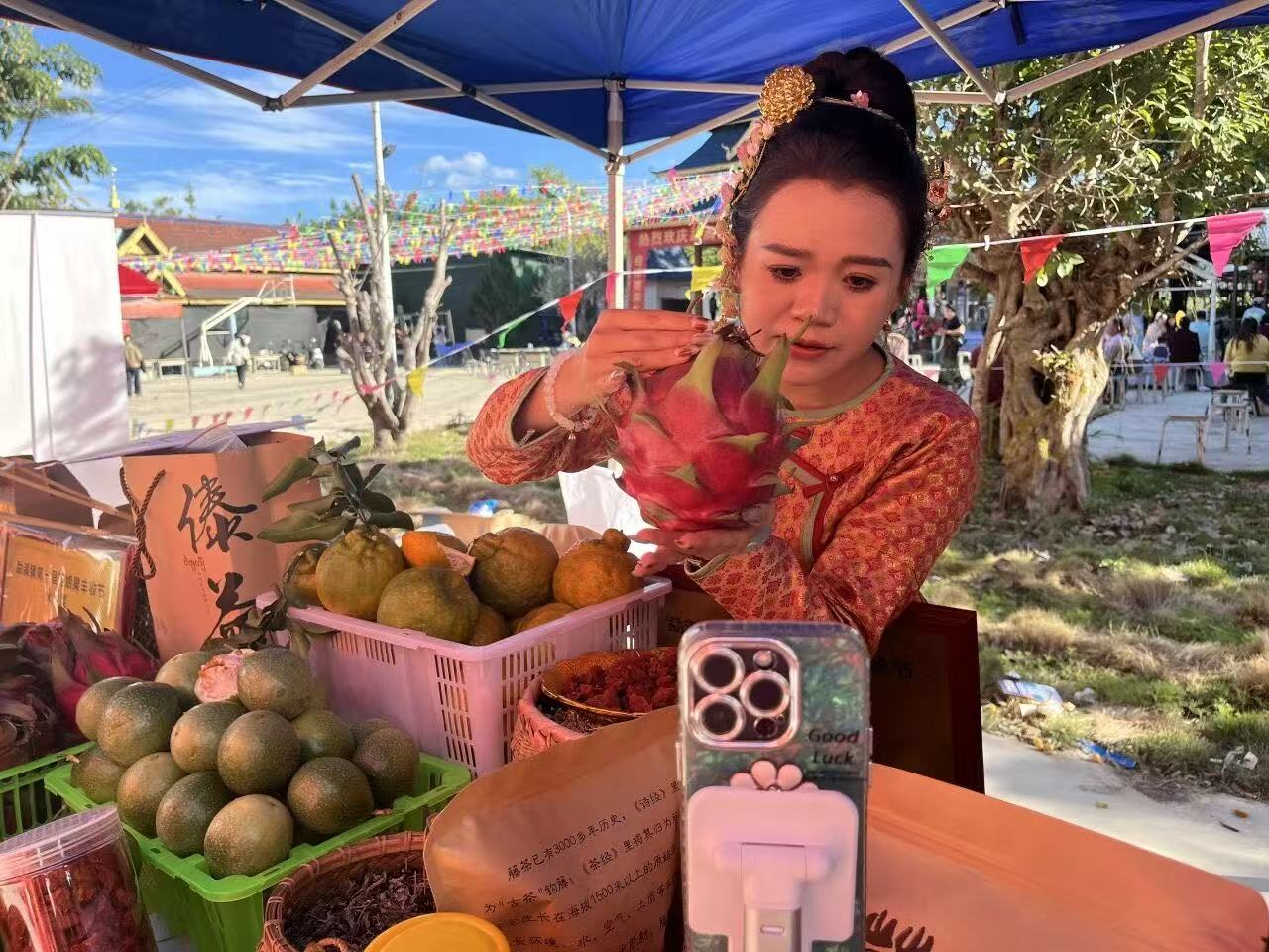 在西双版纳傣族自治州勐海县勐满镇第二届菇娘果丰收节展销区,金黄饱满的菇娘果、脆甜多汁的苹果枣、果香浓郁的勐满橘等特色农产品整齐陈列,党员志愿者穿梭其间热情推介,直播镜头前主播妙语连珠带货,单日销售额一举突破10万元。
