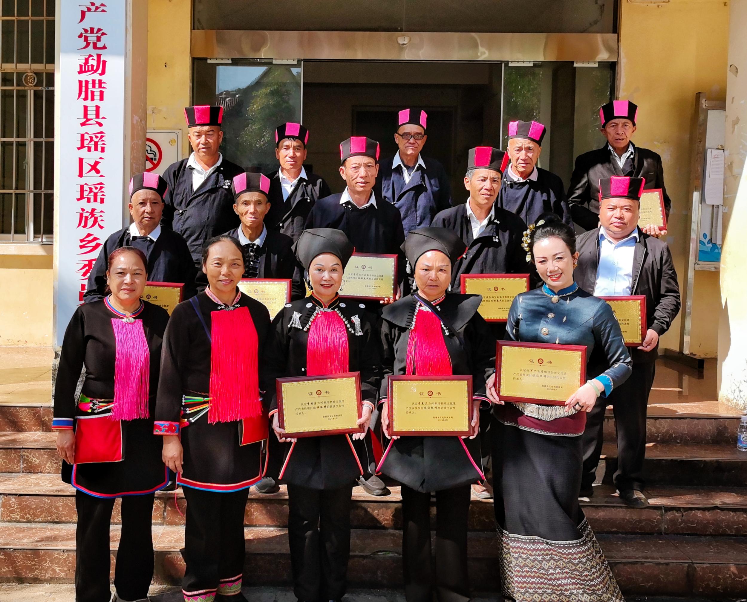 培训期间开展研讨交流环节,强调以“四个自信”激励传承人坚守初心、勇担使命,持续增强非遗人才队伍的荣誉感与责任感。在乡人民政府门前,乡党委、政府庄重举行了非遗代表性传承人证书颁发仪式,身着传统瑶族服饰的银发导师与青年学员手持证书合影,仪式感浓厚,充分体现了地方党委政府对非遗保护的高度重视。通过此次活动,进一步强化了群众对民族文化身份的认同和对“银发技艺人才”作用发挥的认可,凝聚起全社会共同守护民族根脉、增强文化自信的广泛共识。