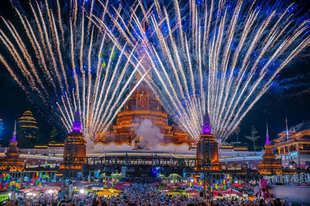 夜间经济亮点纷呈。告庄西双景推出系列傣泐新春主题活动,湄公河·星光夜市灯火璀璨,与大金塔金顶交相辉映,烤肉、菠萝饭、老挝冰咖啡等特色美食香气四溢。大金塔上空绽放的新春烟花秀,成为游客定格浪漫的核心场景。傣泐主题花车巡游、六国民族歌舞汇演等活动,进一步丰富了夜间文旅供给,彰显澜湄流域文化交融魅力。