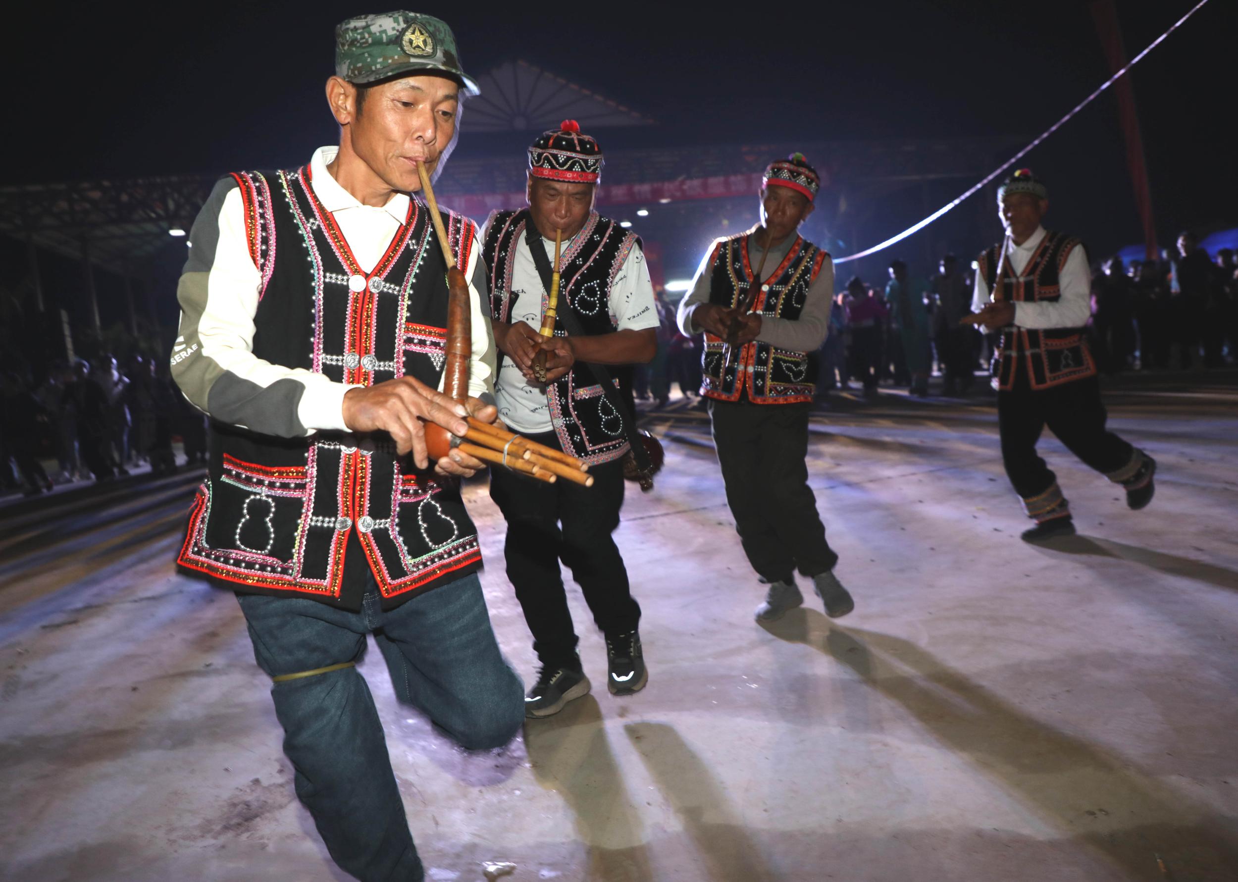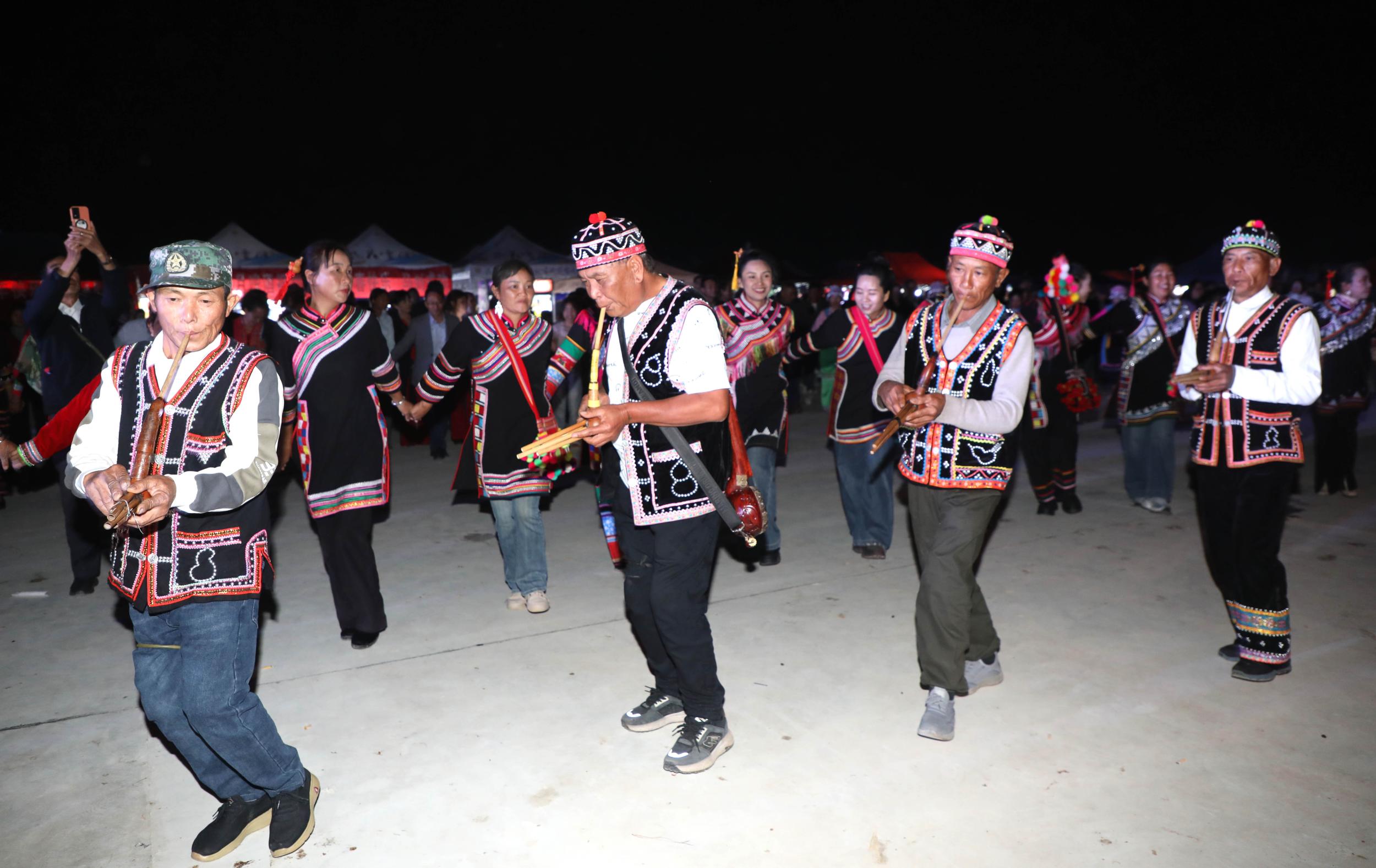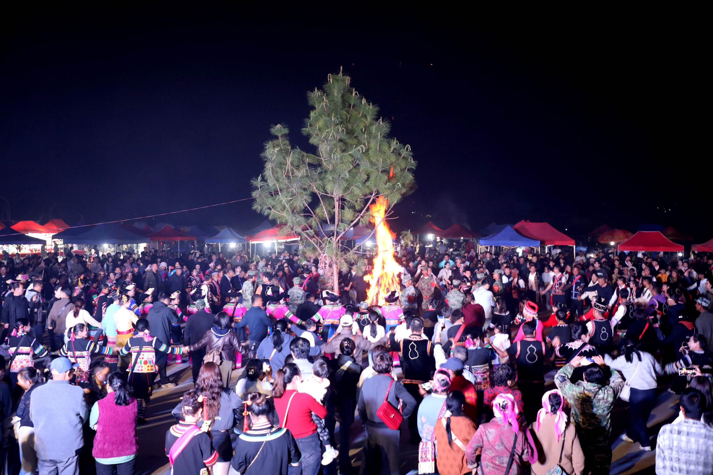 夜幕降临时,活动广场燃起篝火,现场歌声响起、人声鼎沸、热闹非凡。随着一道道璀璨的烟火在天空绽放,数千名男女老少手拉着手围着篝火,合着芦笙和三弦欢快的旋律,或一起跺脚,或一起踮步,按节拍摆手、屈腿、弯腰,边舞边歌。
