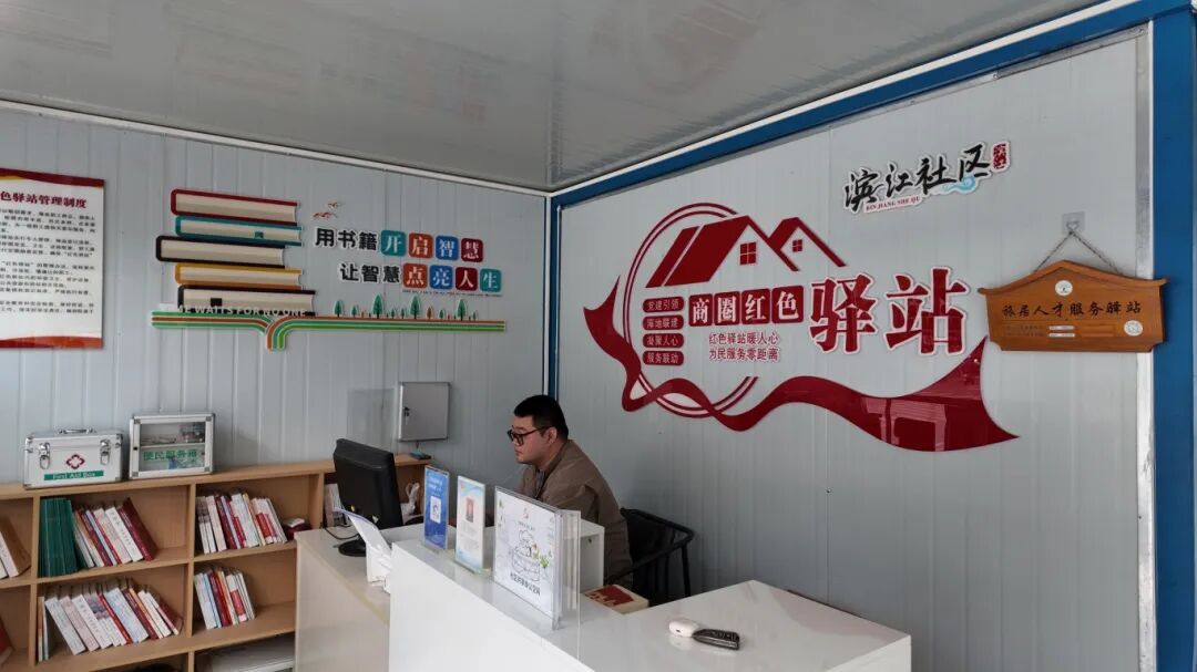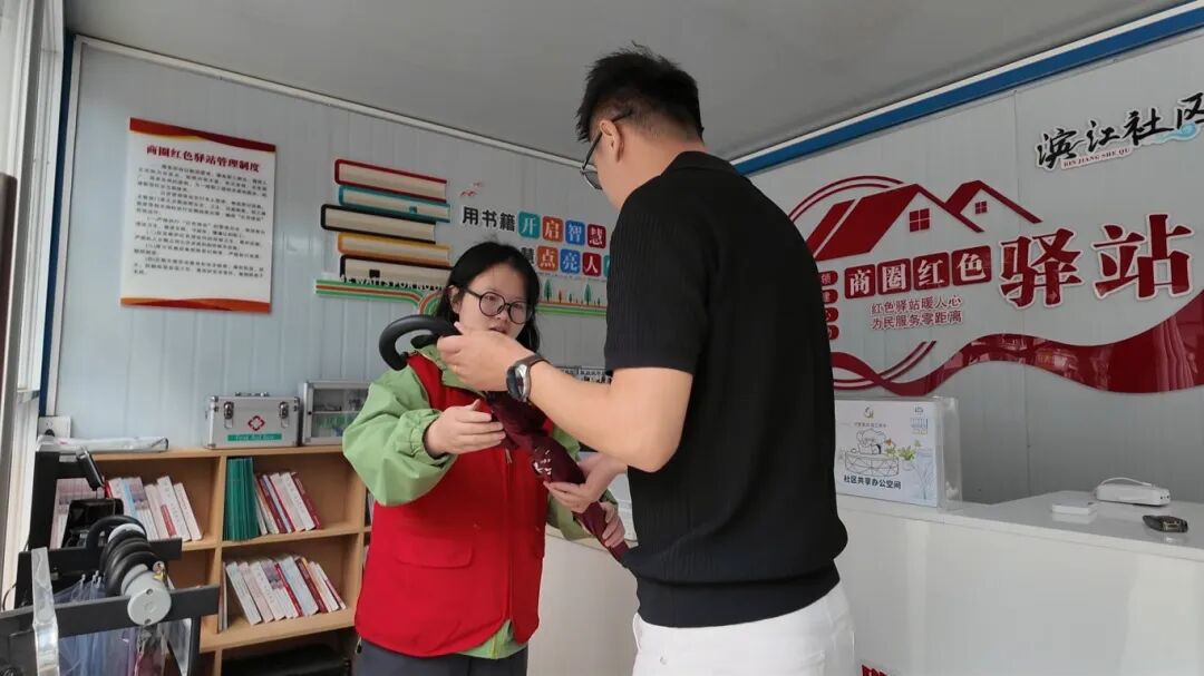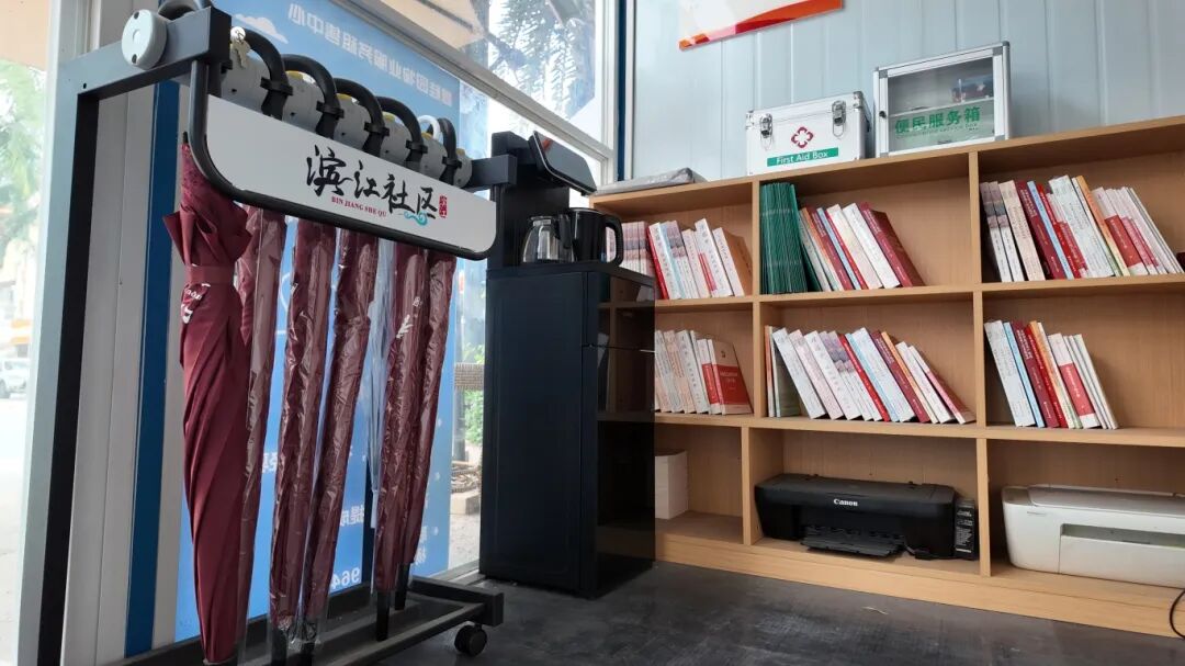 步入滨江社区商圈红色驿站,温馨场景处处可见:外卖小哥在此歇脚充电,忘带雨具的居民借用雨伞,问路的群众向志愿者寻求帮助。驿站内设施齐全,急救箱、便民服务箱、饮水机等常用物品一应俱全,电脑、打印机及泡茶休闲区也免费向群众开放。