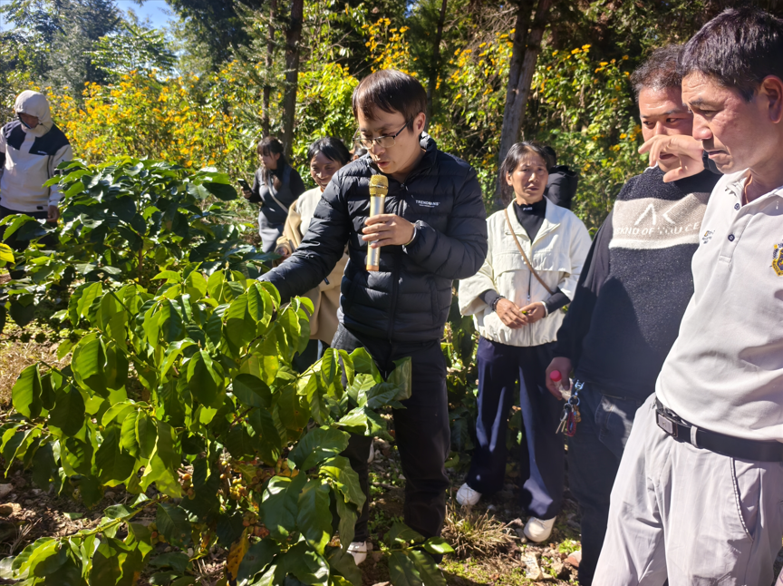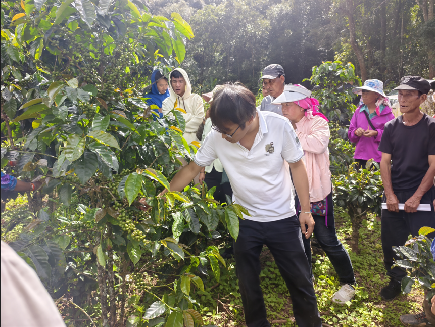 咚咚咚,一阵急促的敲门声把周外吵醒了,驻村不久,一场严峻考验突如其来。2025年8月,正值咖啡生长关键期,部分地块突发病虫害苗头。咖农们心急如焚,急匆匆找到周外:“书记,咖啡树病了!”察觉情况后,周外第一时间协调云南农业大学专家、州县农技人员,组建“三级技术服务队”,把“战场”直接设在咖啡地。连续一周,他与专家团队泡在田间地头,老乡一喊就到,树一病就查,手把手教农户识别病虫、掌握防治时机、规范用药方法,只用一周时间就打下了这场“硬仗”。意识到咖农种植方式过于粗放,周外推动建立“田间课堂+入户指导”机制,协调“三级技术服务队”从栽苗、施肥到病虫害防控、鲜果采摘,开展全流程标准化培训,实现技术入户率100%,南弄村咖啡种植彻底告别“老办法”,走上规范化道路。