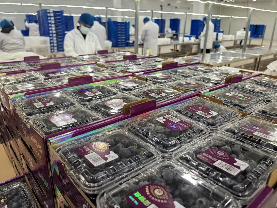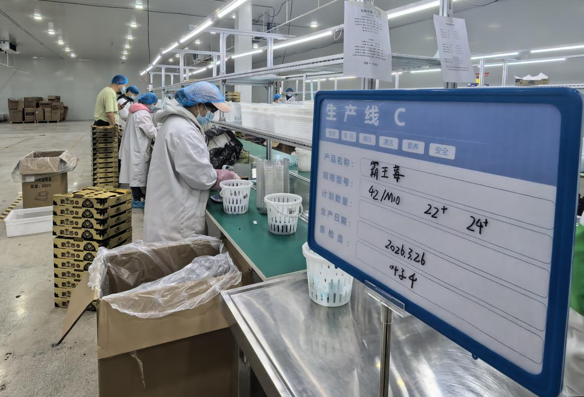 基地冷链车间活力满满,工作人员平均年龄均在30周岁。经过系统专业培训的青年质检员,严格做好蓝莓品质检测与精细化封装工作。入职仅四个月的质检员小叶介绍:“目前经我们车间质检封装外运的蓝莓,总量已超500吨。”青年团队以专业素养严把品控关口,用心守护每一颗果实品质。