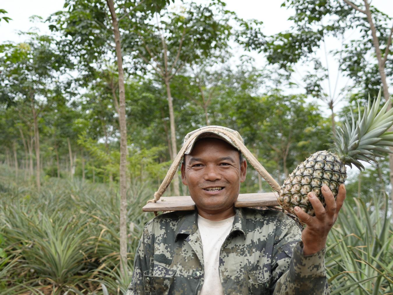 菠萝集中采收还催生了“家门口的零工岗”,为农户带来额外增收。么等老寨村民采收季在基地分拣菠萝,日均能挣120元,一个采收季下来,光打零工就能增收3000元,“照顾家里和挣钱两不耽误”。这种“主业+零工”的增收模式,让胶农在橡胶更新期的收入更有底气。