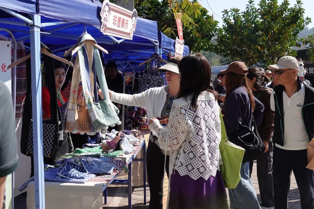 节庆期间,特产集市与非遗集市同步热闹开市,成为活动的另一大亮点。特产集市上,生态茶叶、鲜香酸笋、风味黄牛干巴、软糯紫米等特色农产品丰富多样;非遗集市中,织锦、竹编、特色美食等物品琳琅满目,彰显着民族文化的独特魅力。两大集市摊位鳞次栉比,人流如织、热闹非凡,既满足了游客的味蕾与购物需求,更搭建起村民增收致富的桥梁,实现了文化传承与经济发展的双向赋能、良性互动。