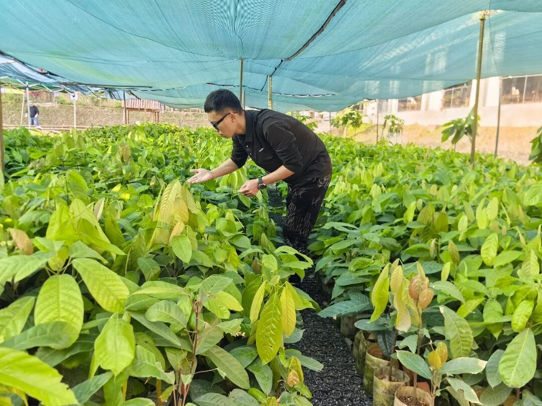 优良种苗是产业发展的根基,在科研力量的加持下,种苗繁育工作正在为产业输送着新鲜“血液”。走进云南省热带作物科学研究所苗圃基地,可以看到一排排可可幼苗长势喜人,叶片翠绿、茎秆健壮,展现出强劲的生命力。